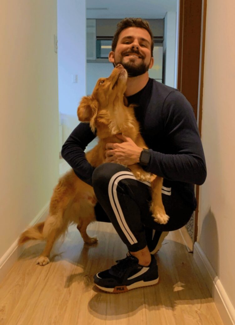 O jornalista Fábio Guillen é um apaixonado por animais. A infância no campo, no norte do Mato Grosso, o fez entender a importância de se preservar e cuidar dos nossos bichos. Na foto, com Fábio, o pequeno Dody, cãozinho vira lata de um amigo dele que sempre fica aos cuidados do jornalista quando o dono viaja.