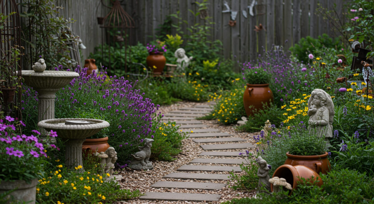 Combinar pedras lisas, pedras de rio e cascalho cria textura visual. Vasos variados e cantinhos de leitura adicionam charme, conforto e funcionalidade ao percurso.