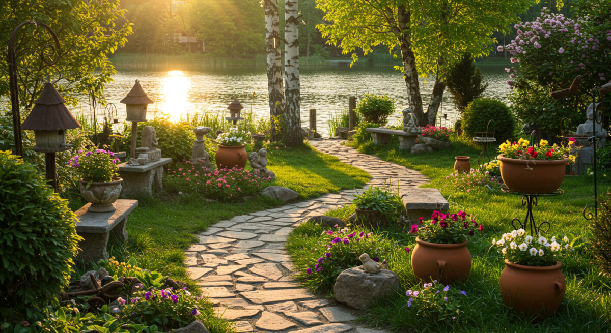 Plantas rasteiras ou pequenas flores entre as pedras transformam a trilha em um percurso orgânico e delicado, harmonizando o verde do jardim com o caminho.