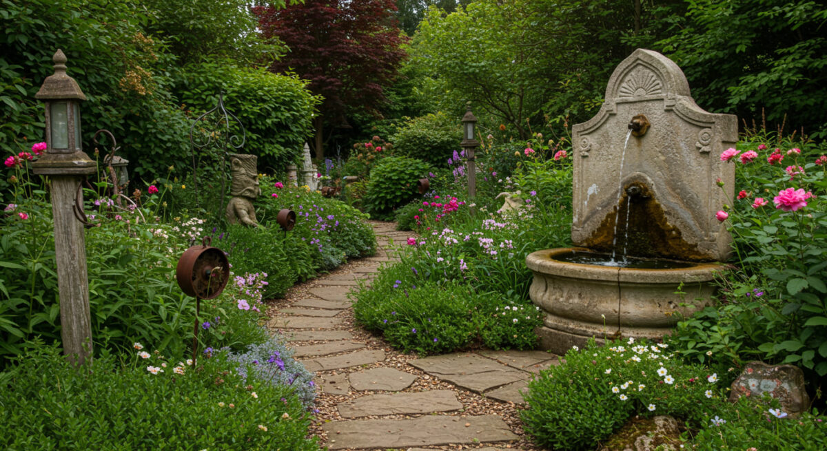 8. Jardim Romântico com Flores Tropicais e Fonte Suave