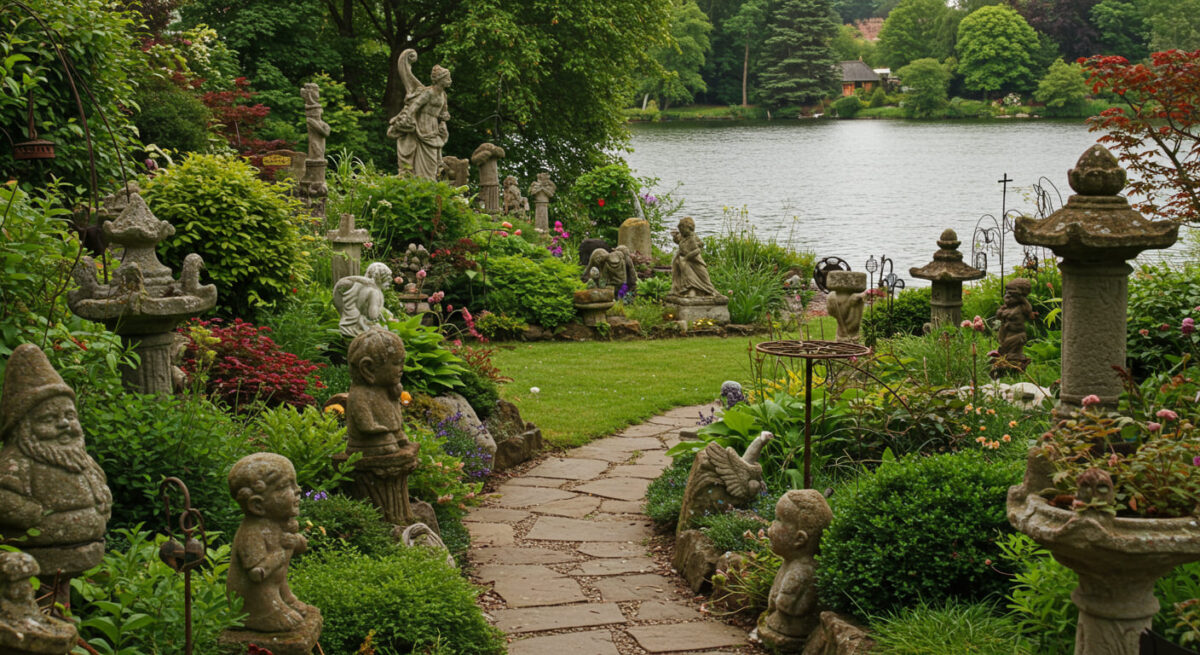 Fontes decorativas ao longo da trilha criam pontos de destaque e estimulam a contemplação, integrando som e movimento com a beleza natural do jardim.
