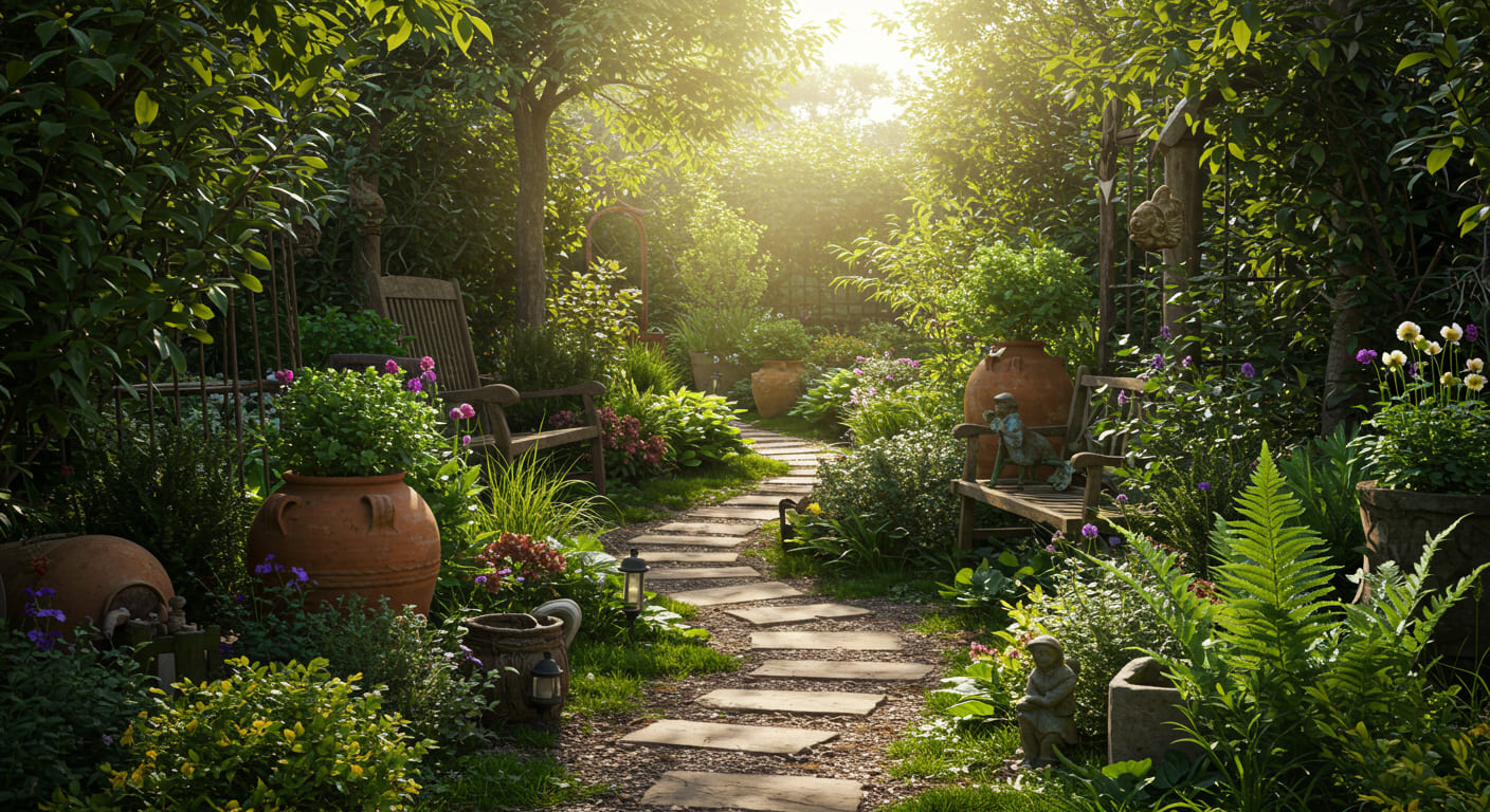 Vasos decorativos e criativos ao longo do percurso adicionam personalidade e estilo, destacando plantas ornamentais elegantes e tornando a trilha visualmente interessante.