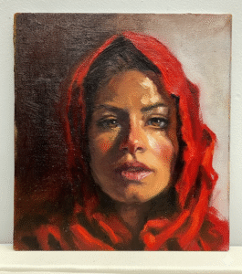 Para Alexandre, a arte não precisa ser um manual de instruções, mas sim um bom quebra-cabeças sem a imagem da caixa. “Se você não entendeu a obra, não se preocupe, provavelmente o artista também não”, ele brinca com seu habitual sarcasmo, mas logo completa: “Mas, hey, é a intenção que conta, não é?”. E a intenção aqui é clara: provocar. A paleta de cores, com o vermelho vibrante do véu contrastando com os tons terrosos do fundo, não é um acidente. É uma escolha deliberada para focar nossa atenção na figura central, nos olhos que carregam histórias não contadas e nos lábios que parecem prestes a sussurrar um segredo. A luz incide de forma dramática, esculpindo o rosto e criando sombras que reforçam a dualidade da personagem – entre a vulnerabilidade e a força, o mistério e a revelação.