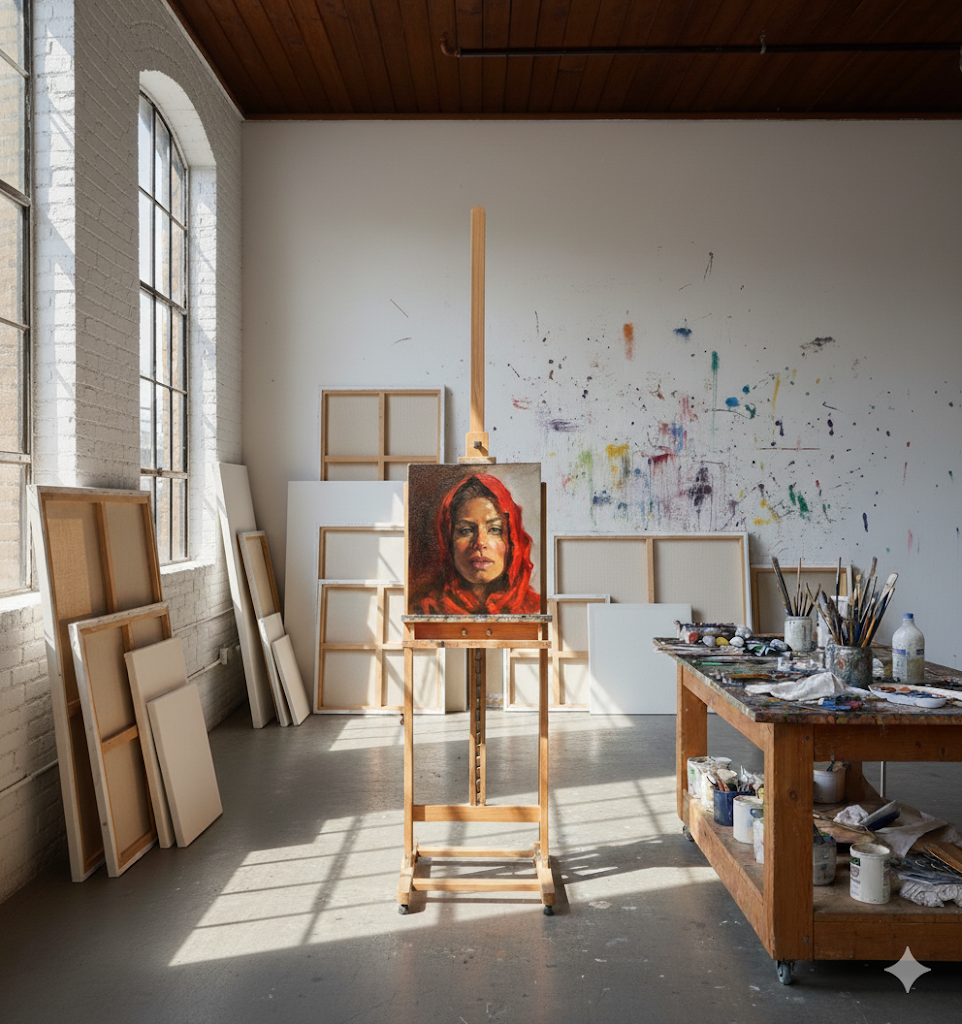 Para Alexandre, a arte não precisa ser um manual de instruções, mas sim um bom quebra-cabeças sem a imagem da caixa. “Se você não entendeu a obra, não se preocupe, provavelmente o artista também não”, ele brinca com seu habitual sarcasmo, mas logo completa: “Mas, hey, é a intenção que conta, não é?”. E a intenção aqui é clara: provocar. A paleta de cores, com o vermelho vibrante do véu contrastando com os tons terrosos do fundo, não é um acidente. É uma escolha deliberada para focar nossa atenção na figura central, nos olhos que carregam histórias não contadas e nos lábios que parecem prestes a sussurrar um segredo. A luz incide de forma dramática, esculpindo o rosto e criando sombras que reforçam a dualidade da personagem – entre a vulnerabilidade e a força, o mistério e a revelação.
