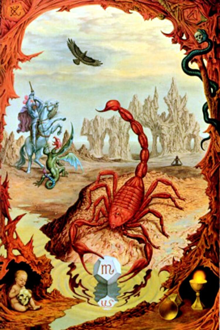 Escorpião é um signo intensamente sexual; portador de grandes poderes para os que sabem manter o CÁLICE, com o Sol-hóstia, luminoso e de pé, e não caído, como se vê no extremo inferior esquerdo da lâmina.