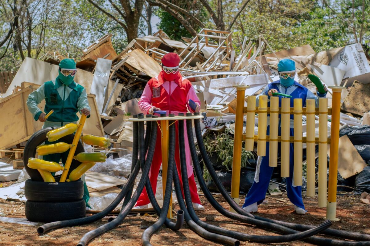 “Durante a pesquisa, recolhemos objetos encontrados e descartados pela cidade. Isso, inclusive, atravessou a minha forma de olhar para a cidade. Apesar de a reciclagem não ser o mote principal, acabou se tornando, porque o meu olhar em busca de novos instrumentos foi meio contaminado por isso. E caramba, quanto lixo, hein!”, comenta o diretor e músico, Fernando Ponce. “A partir da experimentação e da combinação de timbres, ritmos, corpo e melodia, a gente foi estruturando o espetáculo”, explica.