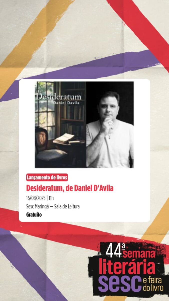 O escritor maringaense Daniel D’Avila fará o lançamento de seu terceiro livro de poesias na 44ª Semana Literária e Feira do Livro Sesc PR, que rola de 13 a 17 de agosto de 2025 em 27 cidades do Paraná.