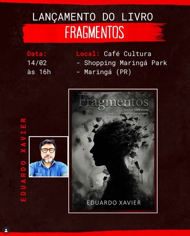 Trata-se de “FRAGMENTOS — Poemas sobre existir, amar e sobreviver ao que se sente”, programado para ser apresentado ao público a partir de 16h, no Café Cultura @cafecultura — Shopping Maringá Park (3º piso), que fica na Av. São Paulo, 1.099.
