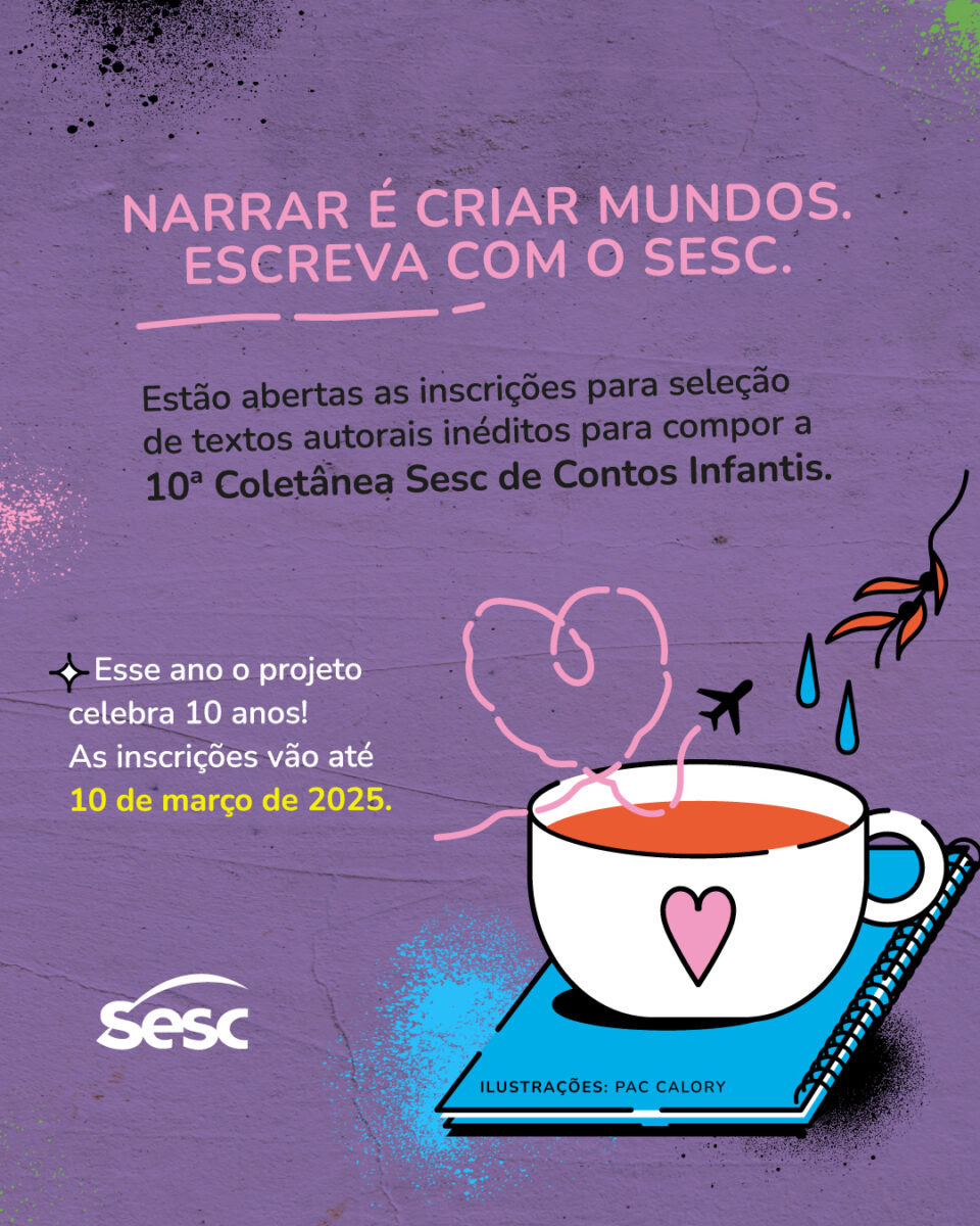 O período de inscrições gratuitas para a seleção da 10ª edição da Coletânea Sesc de Contos Infantis termina nesta segunda-feira, 10 março, às 23h59 (no horário de Brasília), exclusivamente em site: https://encurtador.com.br/2vogV