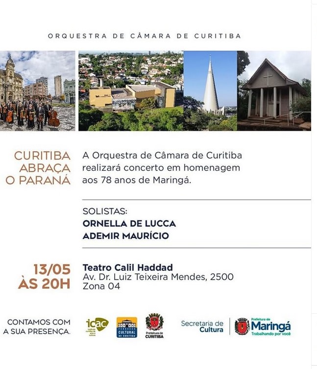 A Secretaria Municipal de Cultura (Semuc) divulgou na manhã desta quarta-feira, 7 de maio, que a Orquestra de Câmara de Curitiba fará um concerto gratuito no próximo dia 13 de maio (terça-feira), às 20h, no Teatro Calil Haddad, em Maringá.