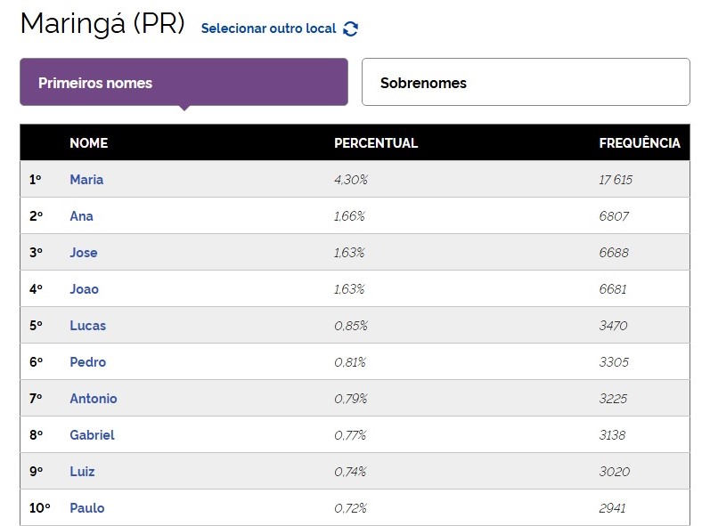 Na consulta aos nomes mais frequentes no ranking do site Nomes do Brasil, é possível perceber algumas curiosidades, como, por exemplo, em Jardim Olinda, no Paraná, onde a cada 100 pessoas, 8 se chamam Maria (8,12% do total da população da cidade). Pelo levantamento por década de nascimento, é possível perceber as tendências de nomes que entram e saem de moda ao longo do tempo, bem como aqueles que aparecem de maneira mais constante.
