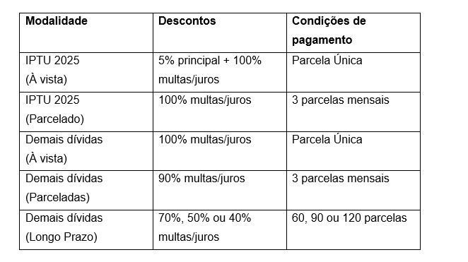 A Regularização Especial oferece descontos progressivos conforme a forma de pagamento (veja tabela abaixo). Para o IPTU e Taxa de Coleta de Lixo de 2025, o contribuinte pode pagar à vista com 5% de desconto no valor principal e 100% em multas e juros, ou parcelar em até três vezes com 100% de desconto em multas e juros. Para demais débitos, os descontos variam de 40% a 100% sobre multas e juros, com parcelamentos que podem chegar a 120 meses.