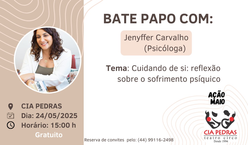 A Cia Pedras Teatro Circo promove e sedia o evento para a comunidade intitulado “Cuidando de si: reflexão sobre o sofrimento psíquico”, neste sábado, 24 maio, das 15h às 16h30. As vagas são gratuitas e limitadas.