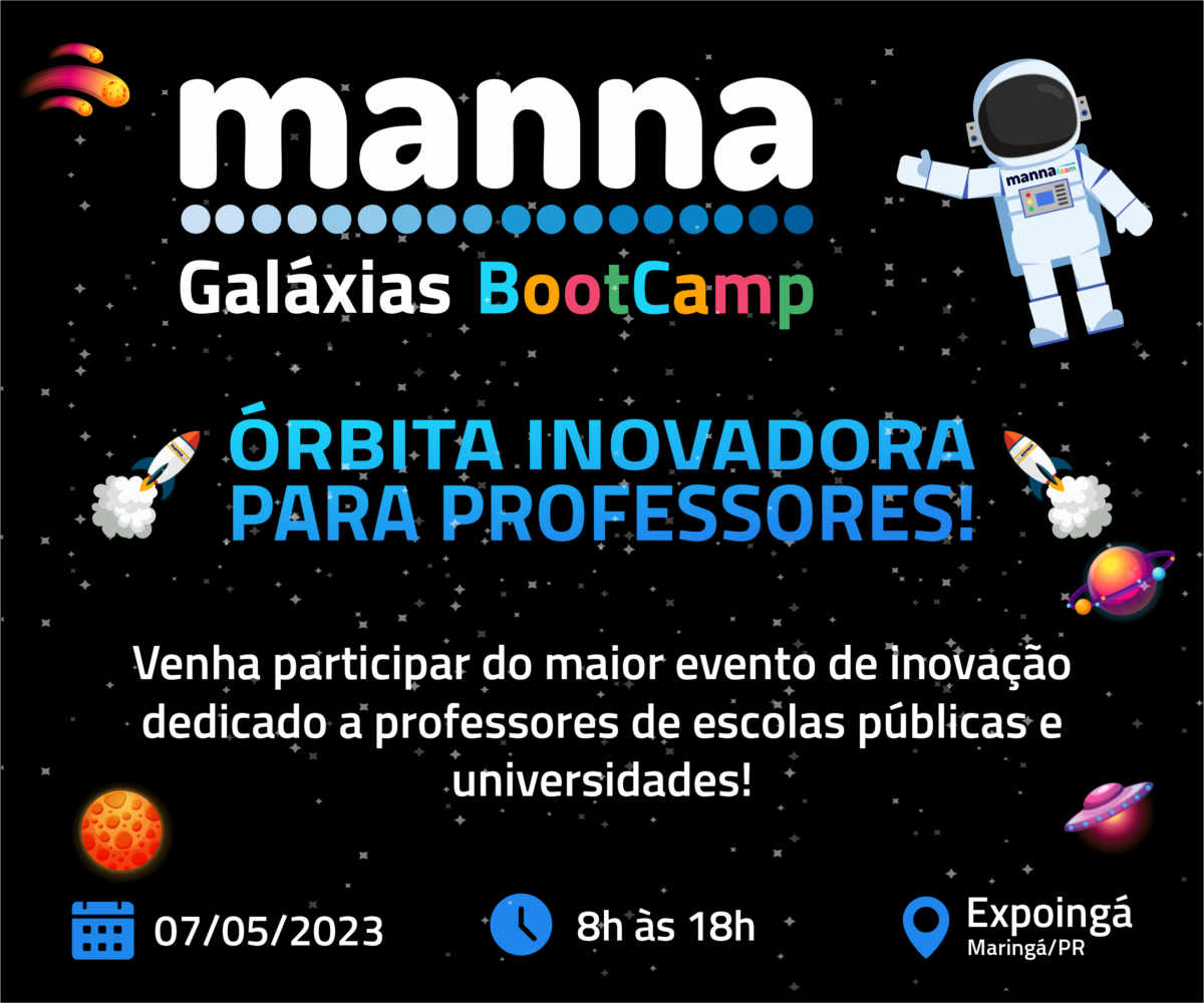 Reunindo professores de todo o país, o MannaGaláxias BootCamp é o maior evento de inovação e educação 5.0 a ser realizado neste domingo, 7 de maio, no período manhã/tarde, em Maringá durante a Expoingá 2023.