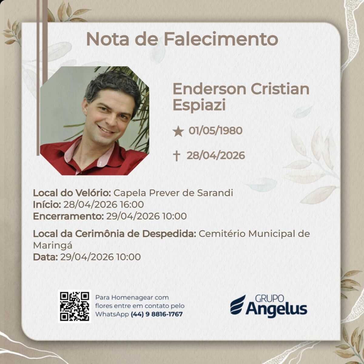 O velório de Enderson Cristian Espiazi será na Capela Prever de Sarandi, a partir de 16h desta terça-feira, 28 abril. Já a cerimônia de despedida, na quarta, 29, às 10h.