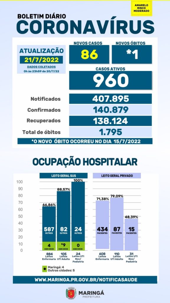 A Secretaria de Saúde da Prefeitura de Maringá informa que foram notificados 86 casos de coronavírus no boletim desta quinta-feira, 21. E foi registrado um óbito por complicações da doença.