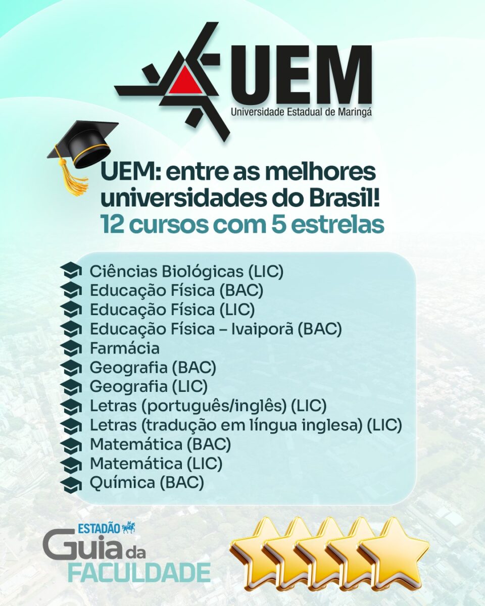 Nesse contexto, a Universidade Estadual de Maringá (UEM) protagonizou o salto mais expressivo, triplicando a representação na categoria máxima na nova edição do levantamento. A instituição ampliou de quatro para 12 cursos com o conceito cinco estrelas, um crescimento de 200%, com oito novas graduações no patamar de excelência. Esse desempenho reforça o papel da UEM como referência acadêmica na Região Sul, impulsionando a qualidade do ensino superior paranaense, com opções de formação de alto nível para os universitários.