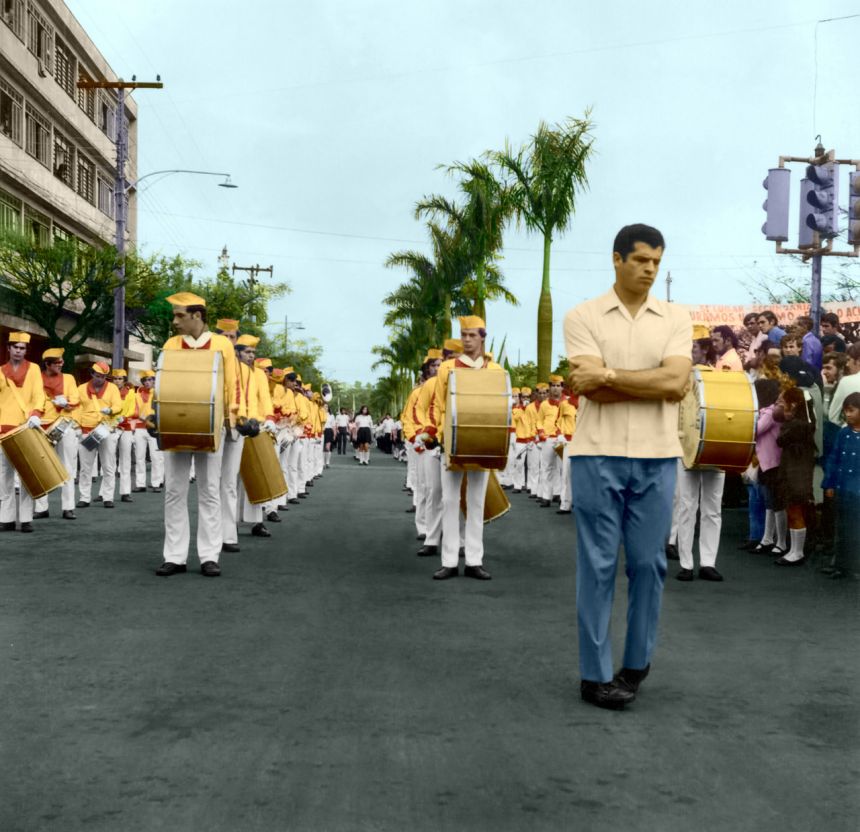 Pedrão à frente da histórica Fanfarra do Colégio Marista Foto preto e branco colorizada por Luiz Carlos Altoé