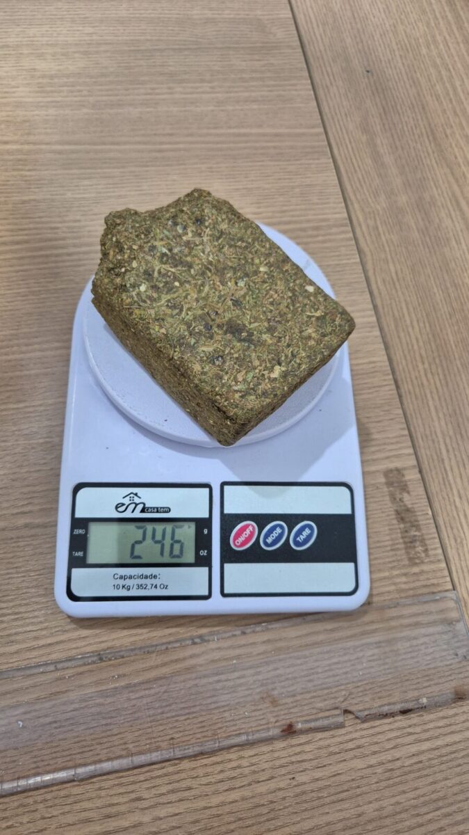 Segundo informações, durante averiguação de denúncia dessa prática de comércio ilegal, uma equipe policial abordou o indivíduo L.D.D.J.C.F.N., que informou ter drogas em seu quarto. Desse modo, os policiais tiveram êxito em localizar um tablete de substância análoga à maconha, pesando 246 gramas.