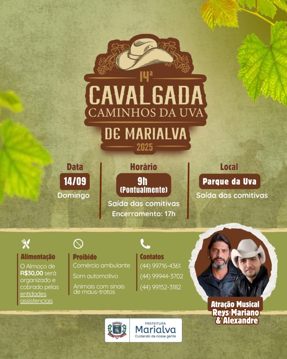 A volta da Cavalgada Caminhos da Uva é destaque no calendário de Marialva, município vizinho a Maringá. A Prefeitura da Capital da Uva Fina convida o público para prestigiar a 14ª edição de um evento tradicional que celebra a cultura, a história e o espírito do campo na região.
