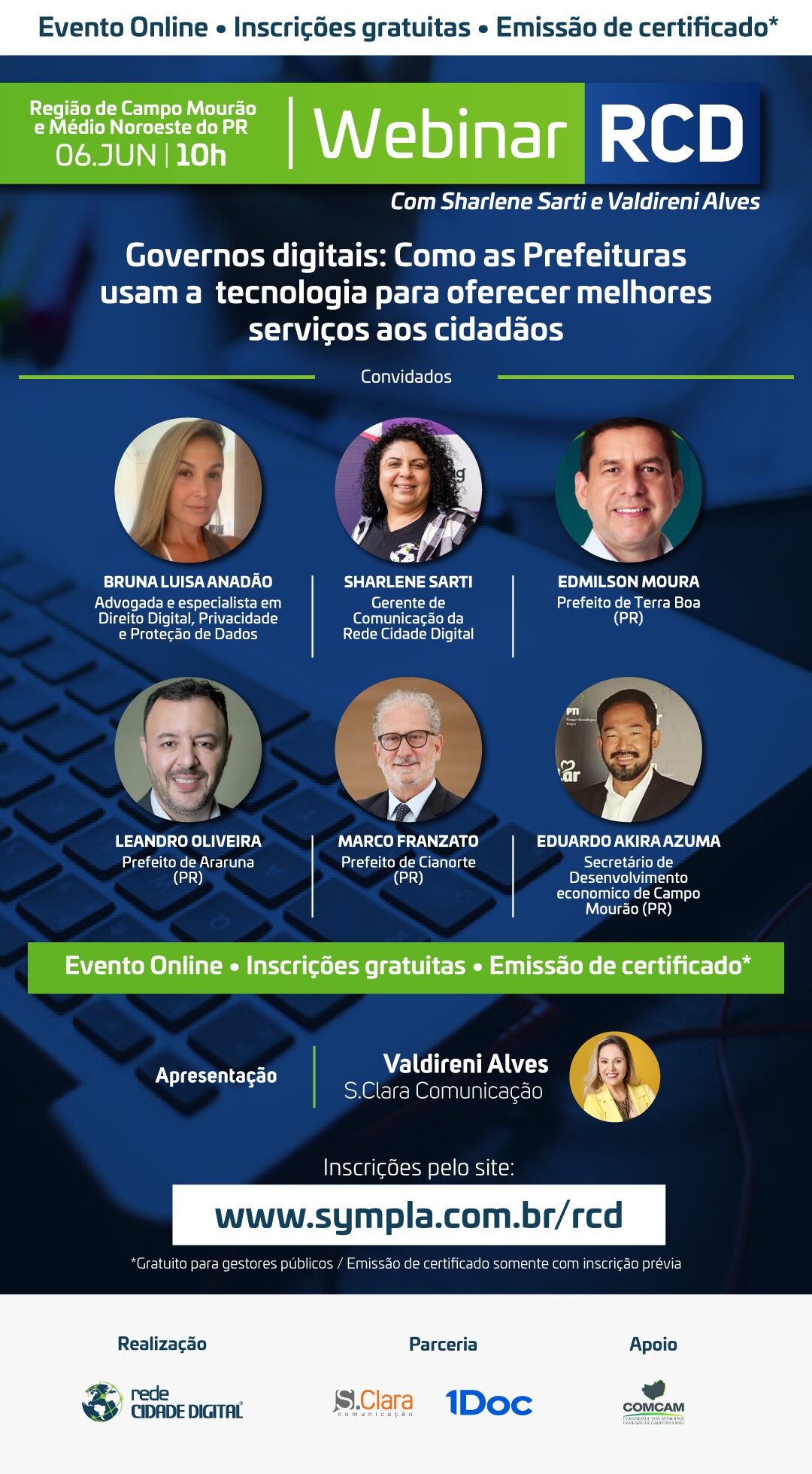 Participam do Webinar das Cidades Digitais os prefeitos de Terra boa, Edmilson Pedro de Moura, de Araruna, Leandro Cesar de Oliveira, e de Cianorte, Marco Franzato. O secretário de Desenvolvimento Econômico de Campo Mourão, Eduardo Akira Azuma, é outro convidado confirmado para apresentar como a cidade usa a tecnologia para oferecer melhores serviços ao cidadão.